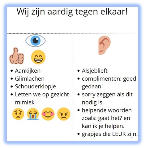 Hoe ziet het er bijvoorbeeld uit als je aardig doet tegen een ander, maar ook wat hoor je als je aardig doet tegen een ander.