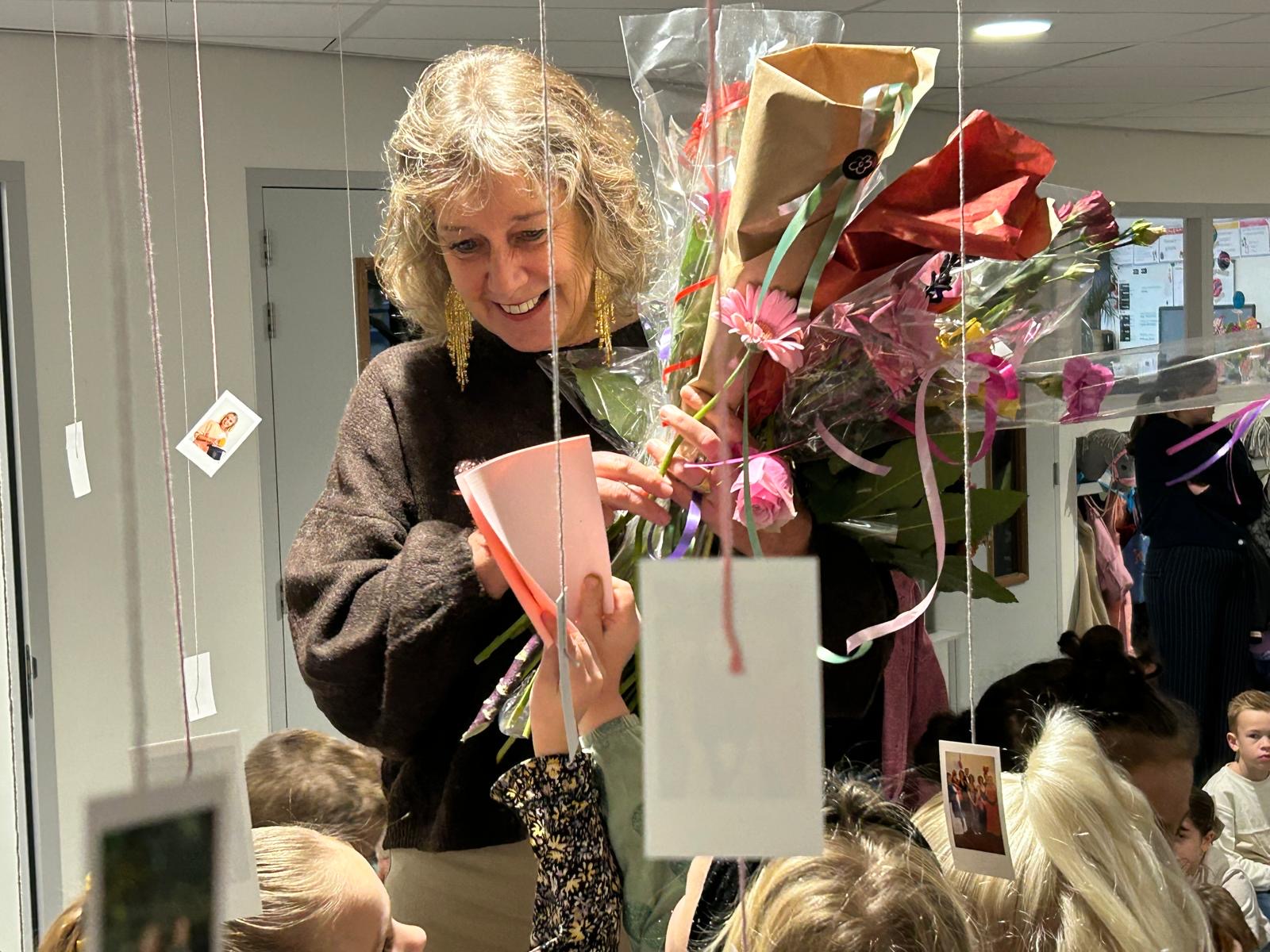 ’s Ochtends werd juf Ida feestelijk ontvangen door alle leerlingen van De Cavaljé. Op het podium werd ze in het zonnetje gezet en kreeg ze van al haar kleuters een prachtige bloem. Namens alle leerlingen en collega’s ontving ze daarnaast een boek vol herinneringen; wat bijzonder om te zien hoe iedereen een eigen pagina had gemaakt! Juf Ida geniet zichtbaar van alle creatieve bijdragen en de mooie woorden die ze mocht ontvangen.